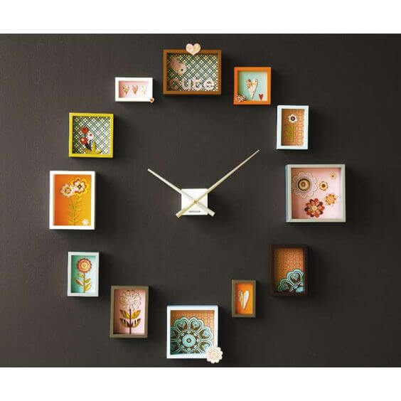 Give your wall a playful twist by turning small picture frames into a one-of-a-kind clock. Arrange twelve frames in a circle, then place a simple clock mechanism in the center.