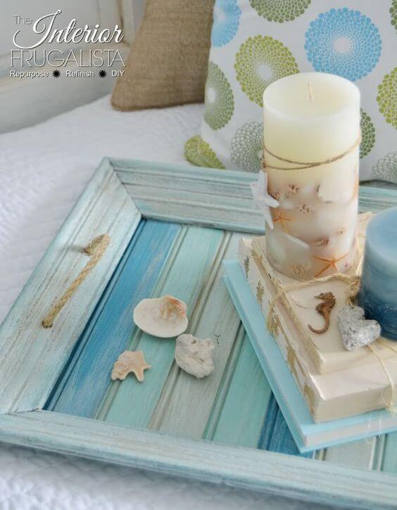 Turn an old picture frame into a charming coastal-themed tray by adding a wooden slat or beadboard base painted in shades of blue and aqua.
