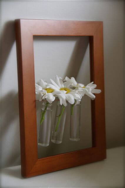 This creative idea turns a plain wooden frame into a charming flower display. Small glass vials are secured inside the frame and filled with fresh daisies, making it look like a floating bouquet.