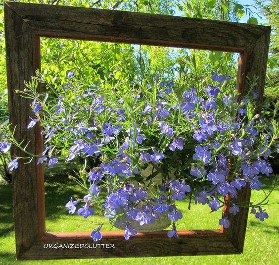 This hanging garden idea turns a simple wooden frame into a stunning backdrop for blooming flowers. The rustic look of the frame contrasts beautifully with the lively purple blossoms, creating a âliving paintingâ effect in your outdoor space.