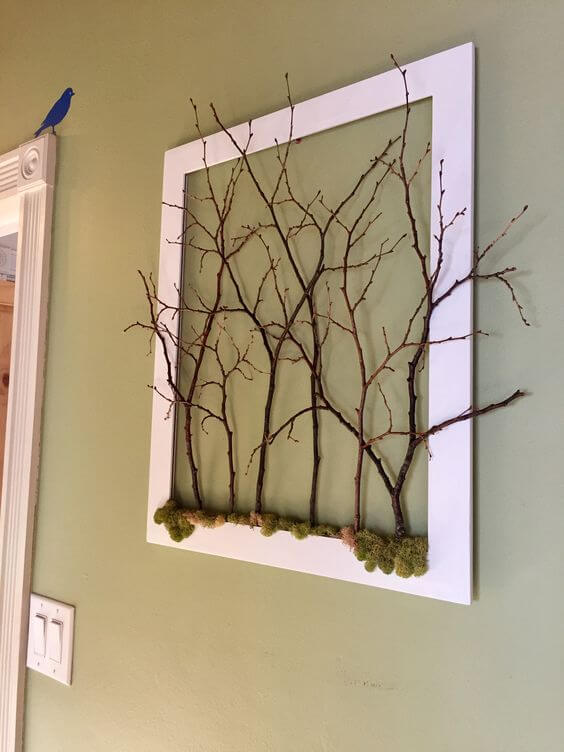 Give an empty wall a touch of nature by turning an old frame into a rustic art piece. Collect a few small branches, trim them to fit, and arrange them inside the frame to create a woodland-inspired look.