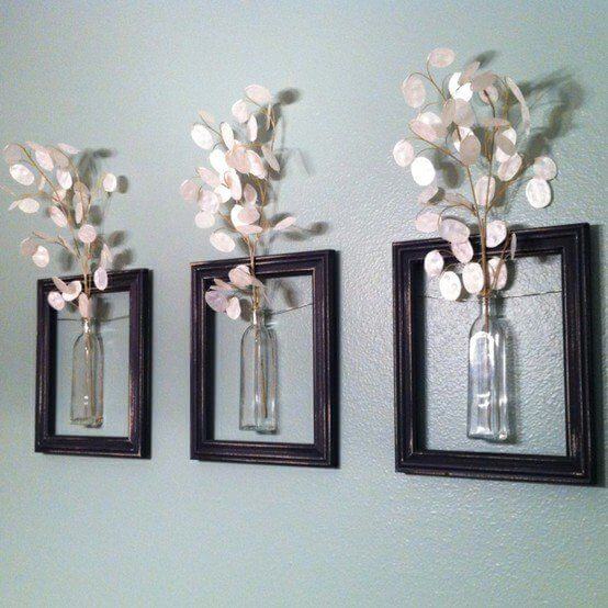 Transform empty frames into elegant wall art by pairing them with glass bottles as vases. Secure the bottles inside each frame and fill them with dried or faux flowers for a minimalist yet artistic effect.