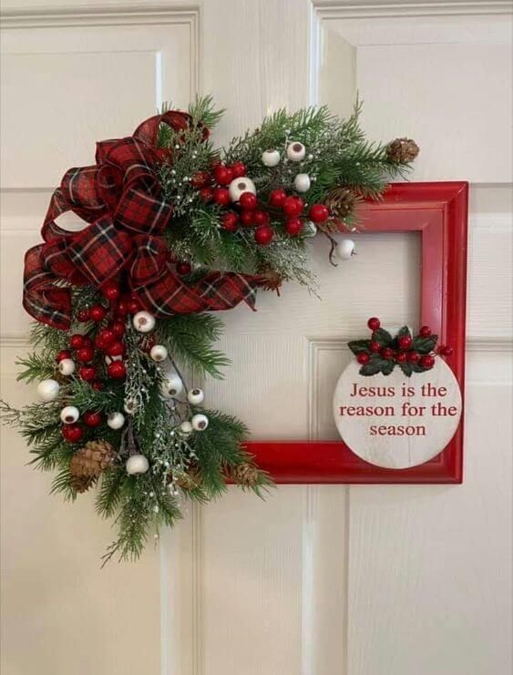 Give a festive twist to a simple photo frame by turning it into a Christmas wreath. This project uses a bright red frame decorated with pine branches, pinecones, berries, and a large plaid bow for a traditional holiday look.