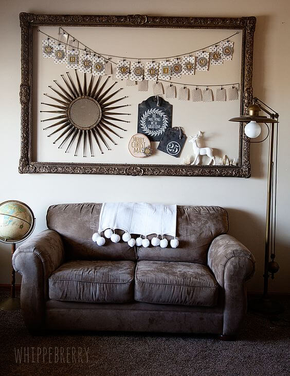 Repurpose a large ornate frame into a statement wall feature. Instead of artwork, fill the inside with layered decorations like mirrors, garlands, chalkboards, and small seasonal accents.
