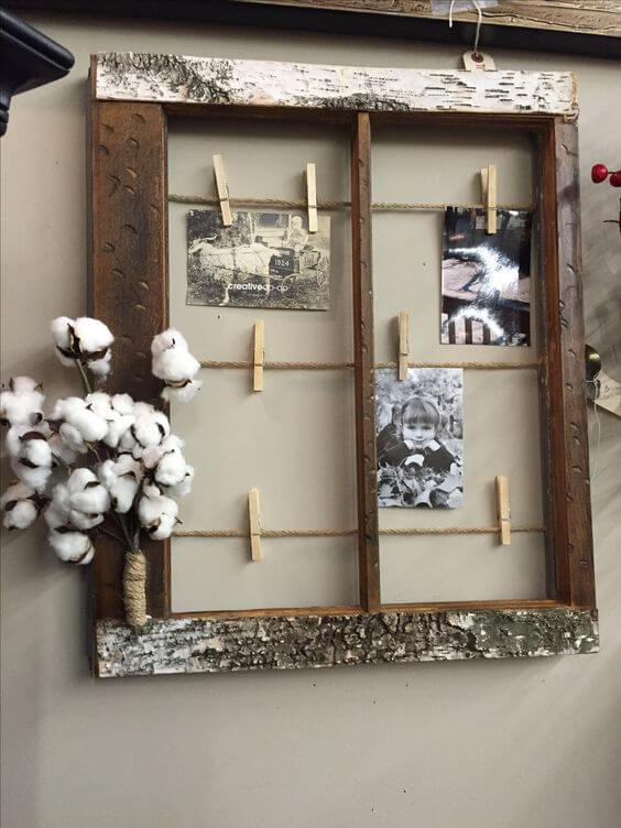 Repurpose an old wooden window frame into a charming photo holder with a rustic farmhouse vibe. The frame is strung with twine lines, and small clothespins are used to hang photos, postcards, or notes.