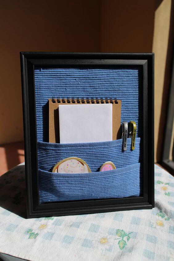 Keep your desk clutter-free with this clever picture frame organizer. A simple fabric backing with sewn pockets instantly turns an old frame into handy storage for pens, notepads, or small accessories.