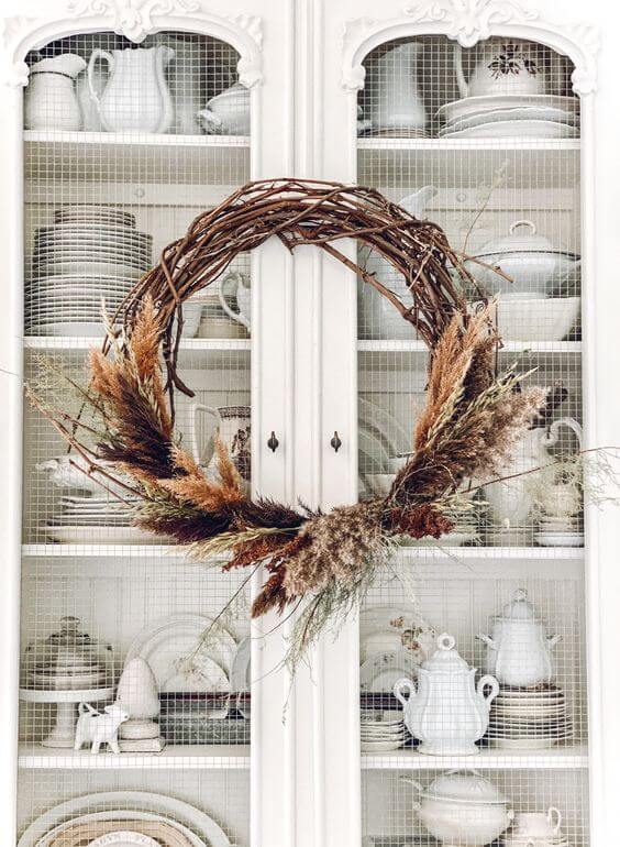 The neutral shades of brown and tan bring warmth, making it fit perfectly in a farmhouse kitchen or on a cottage-style door. To make one, gather dried weeds, seed heads, and grasses, then bundle and tie them to a grapevine or twig frame.