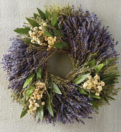 Accents of bay leaves and clusters of tiny cream-colored flowers break up the texture and add contrast, keeping the design lively. To recreate it, tie small bunches of lavender together and secure them around a wreath form, layering as you go.