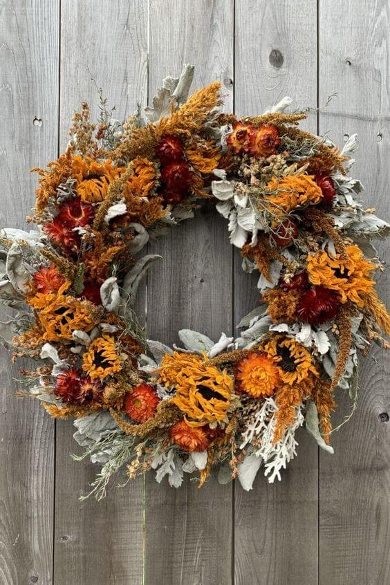 The soft silvery leaves tucked throughout add balance, making the colors stand out even more. You can make one by gathering dried flowers in warm hues and wiring them tightly to a sturdy grapevine or metal ring.