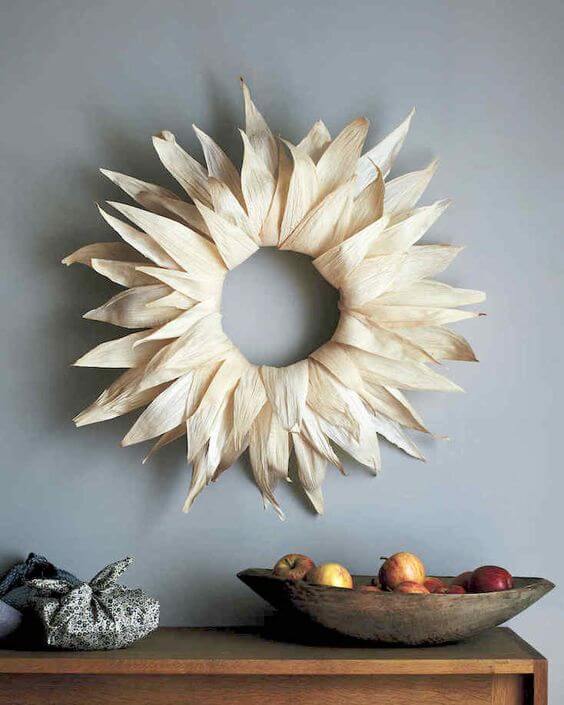 The neutral tones fit beautifully into rustic or modern spaces, making it versatile for any autumn setting. To make one, soak dried corn husks briefly to make them pliable, then layer and glue them onto a wreath form in overlapping circles.