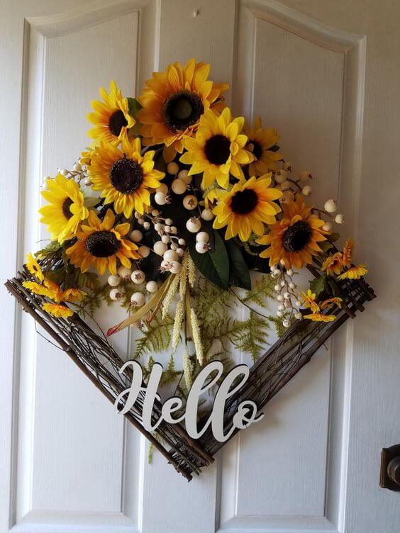A simple âHelloâ sign at the bottom makes it extra inviting and sets a friendly tone right away. To make your own, gather faux or fresh sunflowers, a grapevine or twig base, and add filler like white berries or greenery for contrast.