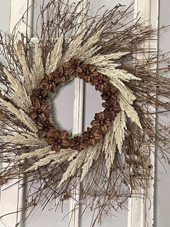 You can recreate this by gathering dried branches, grasses, and seed pods, then attaching them with wire or hot glue to a sturdy wreath form.