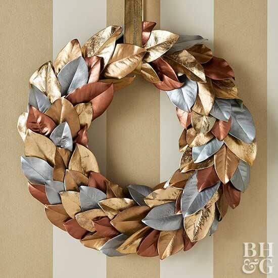 To recreate the look, collect sturdy leaves or faux ones and spray-paint them in metallic tones, then glue them in overlapping rows onto a foam or grapevine wreath form.