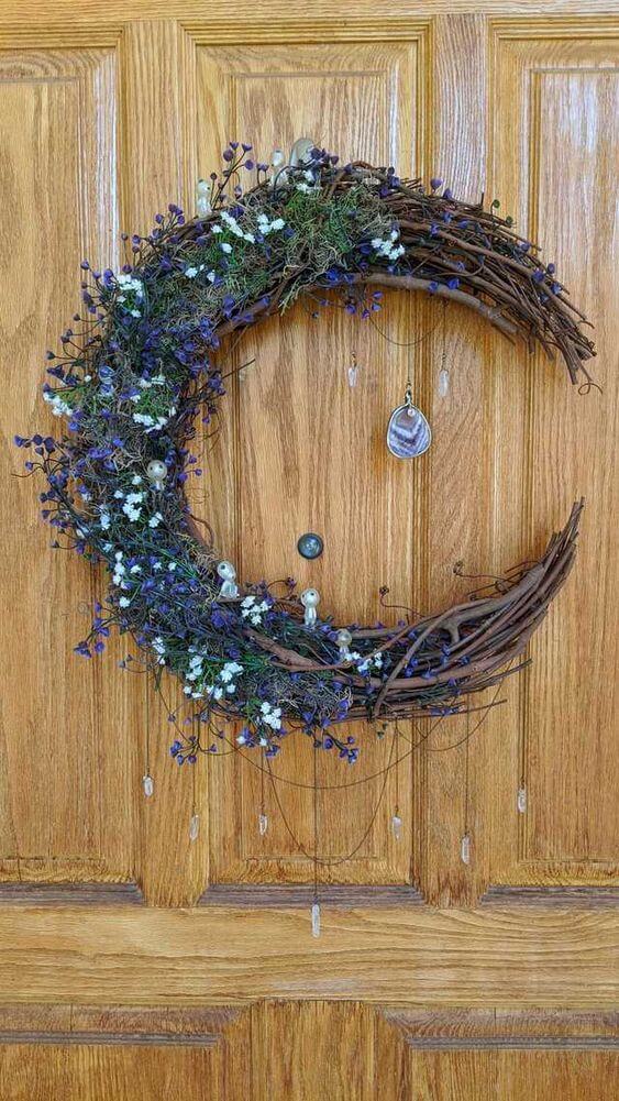 This crescent moon wreath brings a touch of magic to fall decorating. Made with twisted grapevines shaped into a half-moon, it s adorned with delicate sprigs of white and purple flowers, along with bits of moss for an earthy feel.