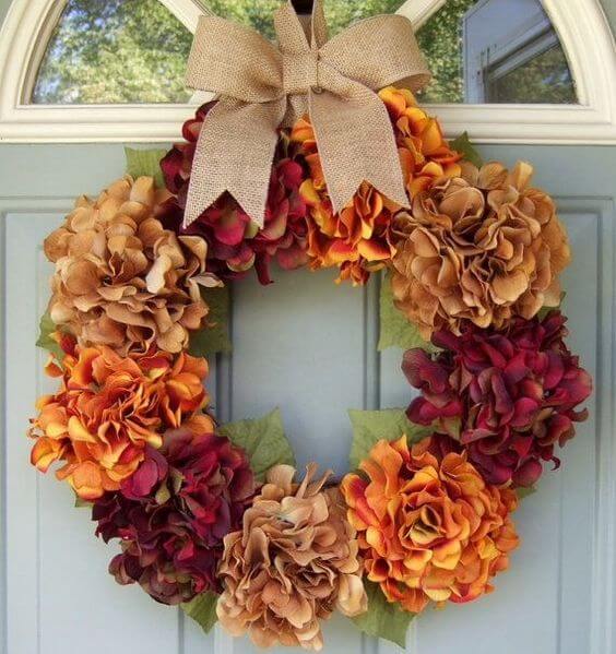 This fall wreath radiates warmth and charm with its lush arrangement of hydrangea blooms in shades of burnt orange, deep burgundy, and golden brown. The full blossoms create a rich, textured look that feels both welcoming and seasonal.
