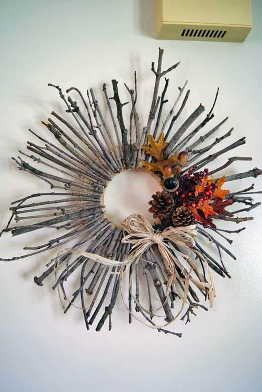 This rustic twig wreath is a wonderful way to showcase the beauty of natural materials. Simple branches are arranged in a radiating circle, giving it a spiky, sunburst effect that feels raw and organic.