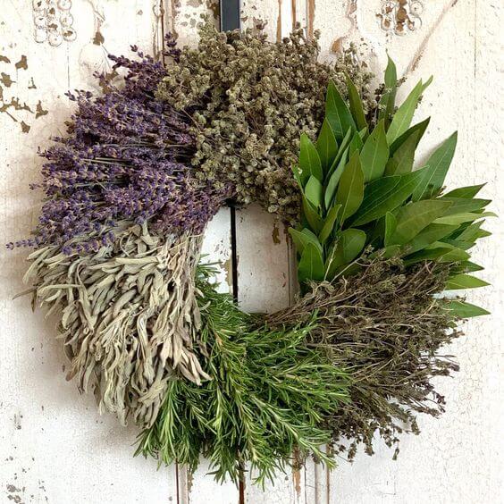 The deep greens and soft purples bring freshness, while the dried herbs create a cozy, old-world feel. To make one, gather fresh herbs, tie them into small bunches, and secure them tightly around a wreath form with floral wire.