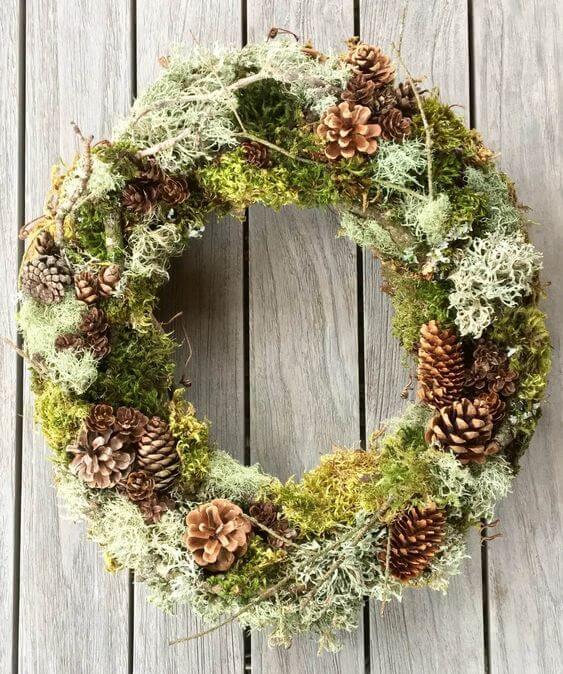 It feels like something you d find on a forest walk and bring home to enjoy. To make one, start with a grapevine or foam wreath form, cover it with moss using hot glue, then add pinecones in small clusters for balance.