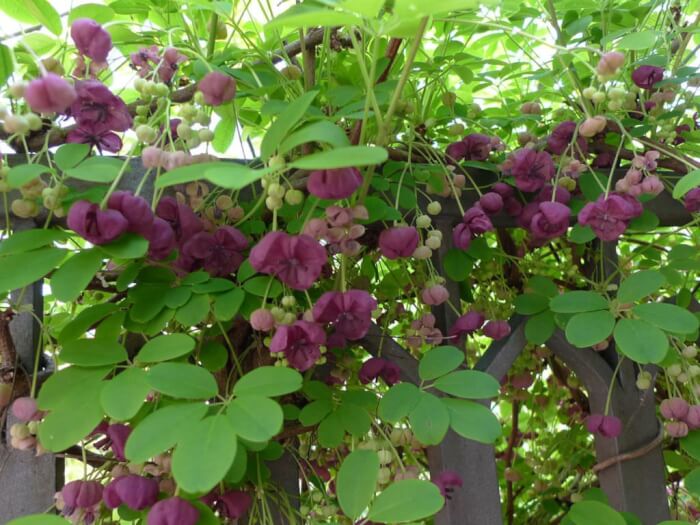 Chocolate Vine, also called Akebia, produces purple-brown flowers with a sweet scent. It grows rapidly, so sturdy support is essential. Plant in fertile, moist soil with sun to partial shade.