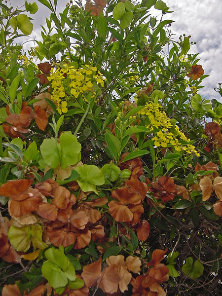 Butterfly Vine, also called orchid vine, produces yellow flowers followed by seed pods shaped like butterflies. It loves full sun and grows best in well-drained soil. Train it on fences or garden walls for coverage.