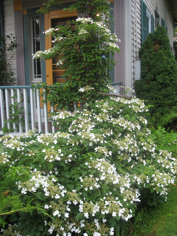 Climbing Hydrangea is a strong vine that produces clusters of white flowers in summer. It can cling to walls or climb large trees with its aerial roots. Plant it in rich, moist soil and keep it watered during hot spells.