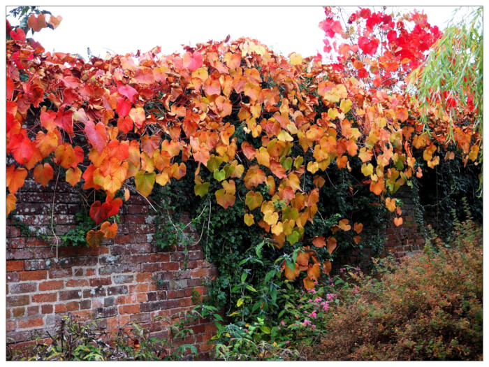 This vine impresses with deep green leaves that turn crimson in fall, alongside fragrant white flowers. Plant it in full sun for the best foliage color. Give it sturdy support, such as pergolas or walls.