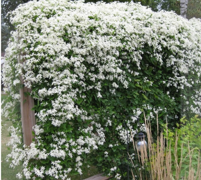 Sweet Autumn Clematis produces masses of small, white flowers that blanket the vine in late summer. It grows fast and quickly covers arbors or fences. Plant it in well-drained soil and give it plenty of sunlight.