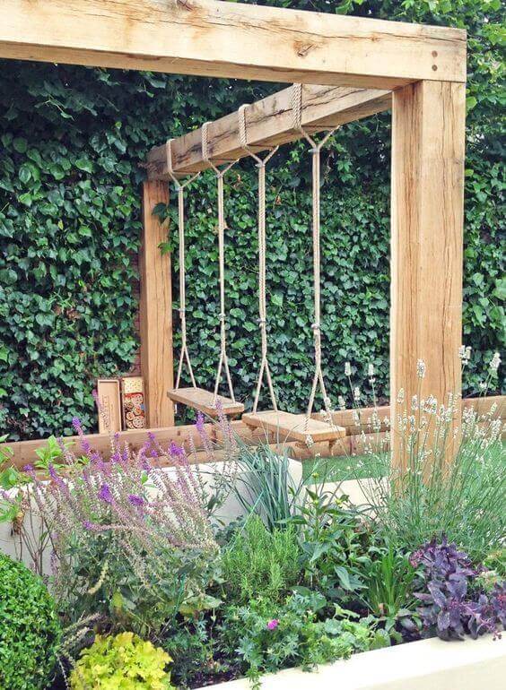 #18 Two Wooden Swings Next To Green Wall and Flowers Around
