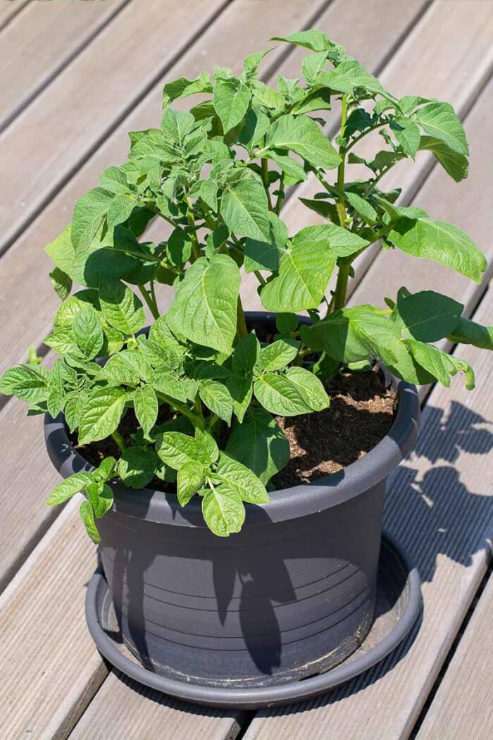 Potatoes are fun to grow in large, deep pots or bags. Start with seed potatoes and cover them with soil as shoots grow. Keep soil moist and mound up more soil around stems as they lengthen.