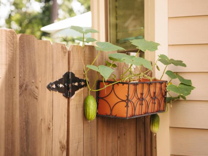Cucumbers climb well in containers when given a trellis or stake. Use a wide pot with rich, moist soil. Keep them in a sunny spot and water often.