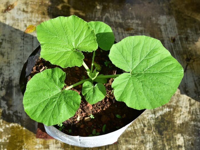 Provide a stake or cage if needed. Harvest when fruits are small and tender for best taste. Squash plants are prolific and rewarding in pots.
