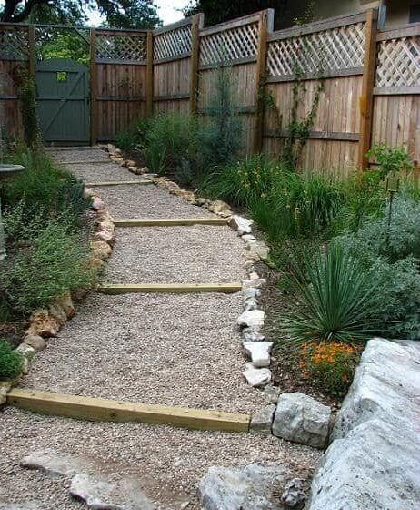 This gravel pathway framed with wooden dividers is a simple yet striking solution for long gardens. The clean lines created by the timber keep the gravel in place while also breaking the path into neat sections that guide your walk.