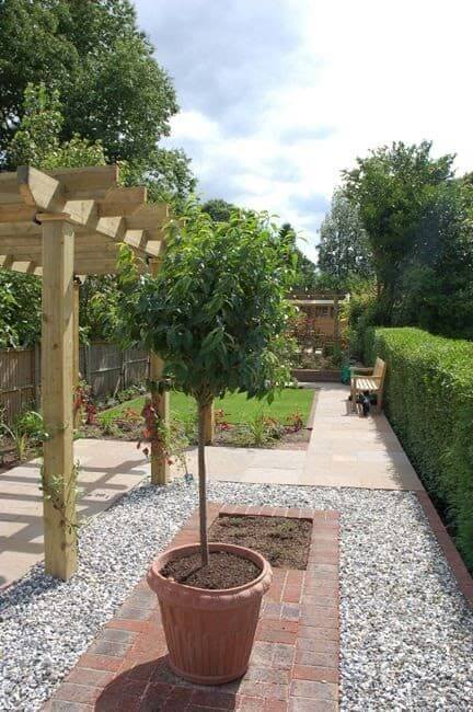 This layout brings a structured charm to a long garden by combining clean lines with thoughtful details. A brick-edged pathway leads the way, softened by gravel and a central potted tree that acts as a living focal point.