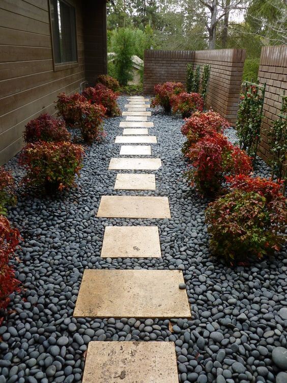 This landscaping idea brings a sleek and contemporary vibe to a long garden path. Smooth black pebbles cover the ground, creating a striking contrast against the light-colored square stepping stones.