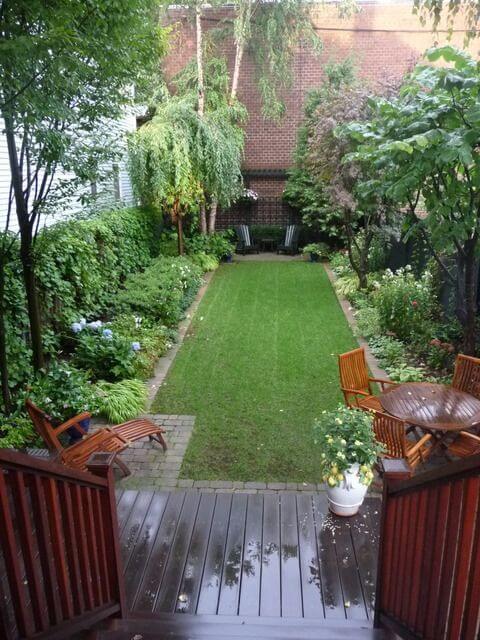 Wooden furniture at both ends turns the area into a place for dining, relaxing, or even reading under the trees. To bring this idea to life, keep the lawn trimmed and healthy with regular watering and edging for crisp borders.