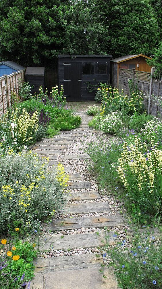 This garden design shows how a simple pathway can completely transform a long, narrow space. Wooden planks paired with small river pebbles guide your eyes straight to the shed, creating a sense of direction and purpose.