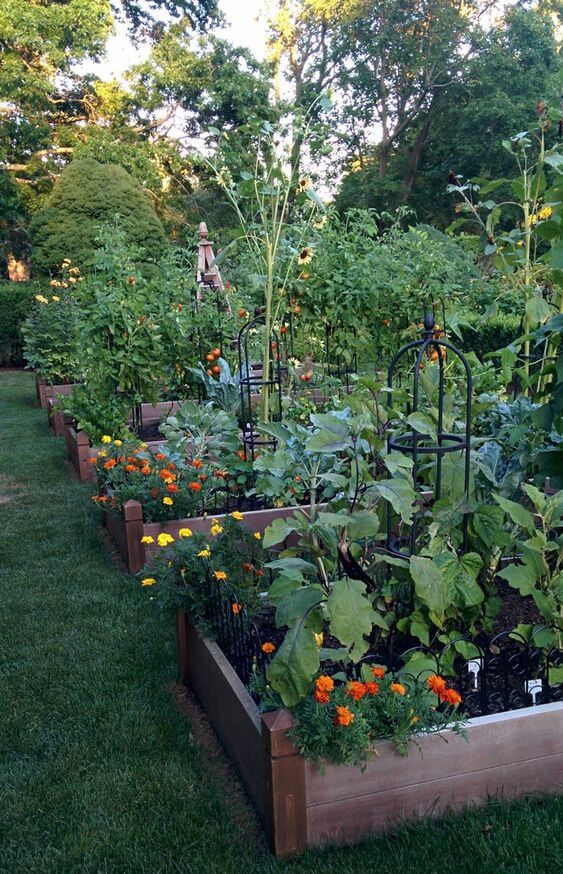This raised garden bed design brings order and abundance to a long garden. The neatly framed beds make it easy to separate vegetables, herbs, and companion flowers, creating a space that feels both productive and inviting.