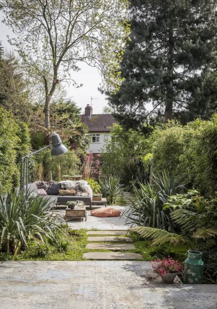 Tall trees and shrubs provide natural screening, making the space feel like a hidden sanctuary. Adding different textures, from ferns to spiky foliage, creates a balanced, jungle-like vibe.