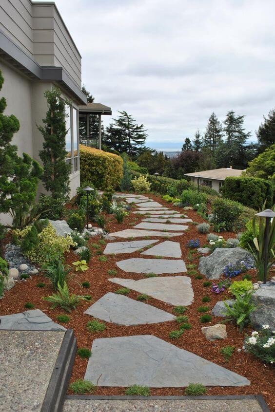 To achieve a similar look, position large flat stones with gaps for ground cover plants to peek through, then frame the path with a mix of hardy shrubs and perennials. Finish by placing a few accent rocks or solar lights to highlight the pathway in the evenings.