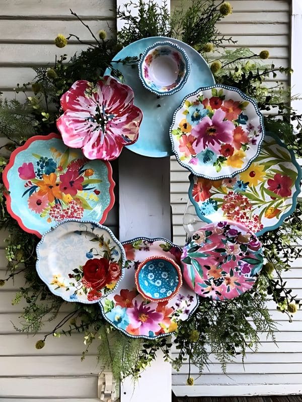 #10. Charming Floral Plate Recycled Christmas Wreath