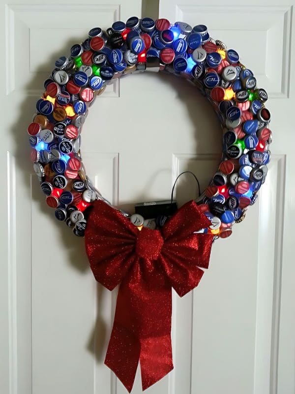 #17. Vibrant Bottle Cap Recycled Christmas Wreath