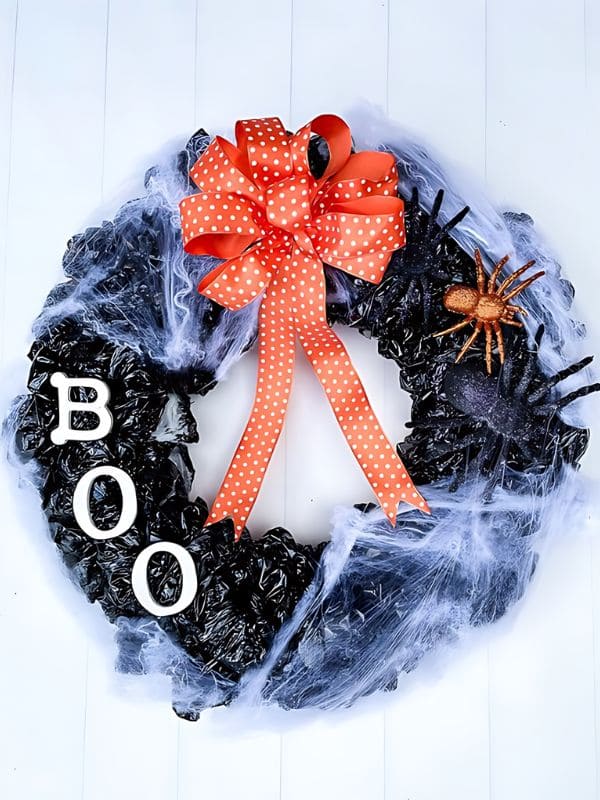 #21. Eco-Friendly Spooky Wreath Crafted from Recycled Plastic Bags