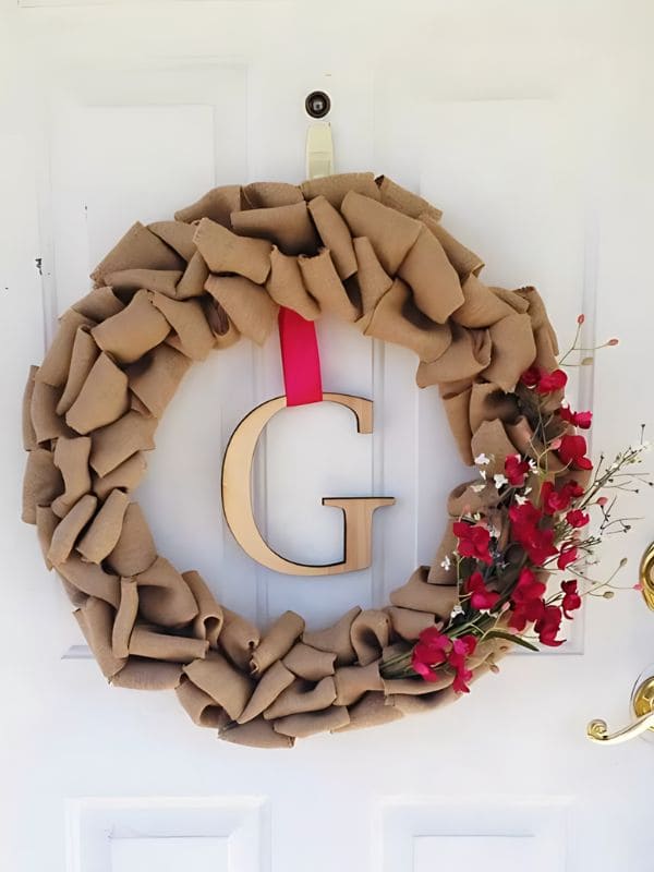 #24. Elegant Burlap and Floral Monogram Christmas Wreath