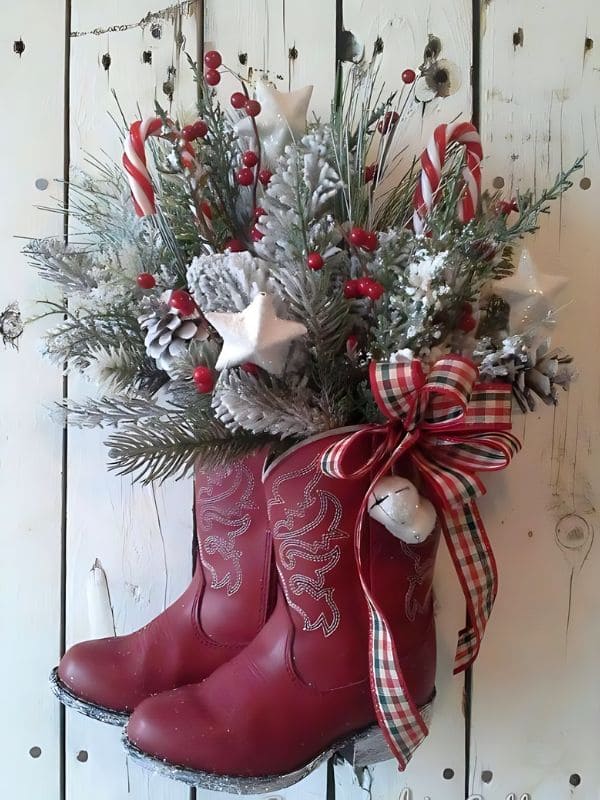 #1. Charming Recycled Cowboy Boot Christmas Wreath