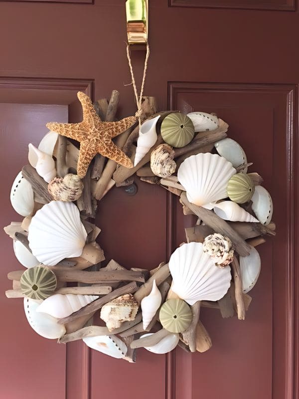 #7. Coastal Charm Driftwood Seashell Christmas Wreath
