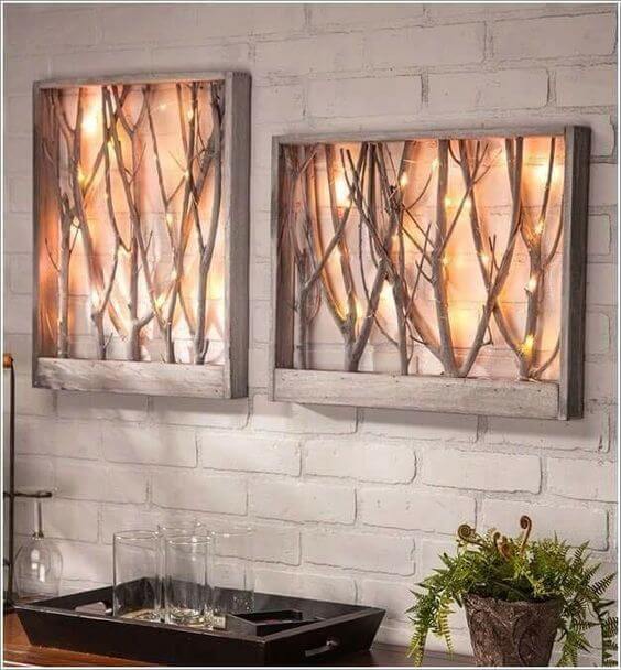 To make it, gather some branches, place them inside a wooden frame, and weave fairy lights through for a soft glow. Hang one frame for a simple touch or pair them together for more impact, just like in the picture.