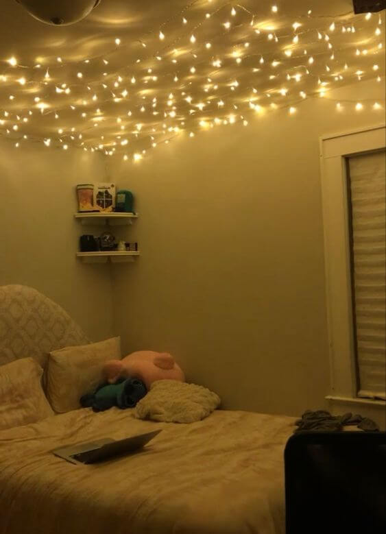 This cozy bedroom glows with a canopy of warm fairy lights stretched across the ceiling, creating the illusion of sleeping under a starlit sky.