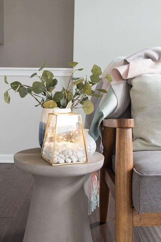 This DIY Fairy Light Lantern is simple yet so elegant, making it perfect for brightening up a side table or shelf. The mix of white pebbles at the base and warm lights inside the glass frame creates a soft, glowing effect that feels fresh and modern.