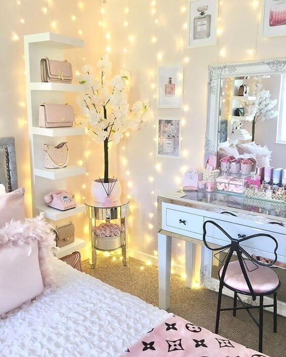 You can easily recreate this look by draping string lights behind your bed or desk to give the room a cozy, golden backdrop. Add a few pastel accessories and mirrors to reflect the light, making the room appear brighter and more open.