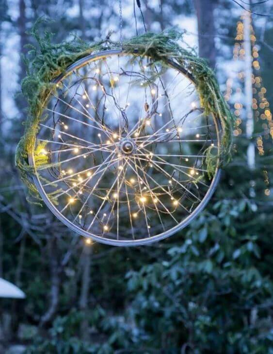 An old bicycle wheel takes on a new life when you dress it up with fairy lights and a touch of greenery. The spokes sparkle like tiny stars, turning a simple piece of metal into something magical for your garden.